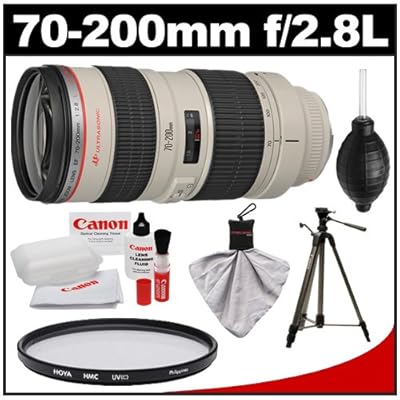 Kit includes:♦ 1) Canon EF 70-200mm f/2.8L USM Zoom Lens♦ 2) Canon 62" Deluxe Photo/Video 300 Tripod with 3-Way Panhead & Case♦ 3) Hoya 77mm HMC UV Digital Multi-Coated Slim Frame Glass Filter♦ 4) Canon Optical Digital Camera & Lens Cleaning Kit (Brush, Microfiber Cloth, Fluid & Tissue)♦ 5) Precision Design Deluxe Hurricane Blower♦ 6) Precision Design Spudz Microfiber Cleaning Cloth (with Clip & Case)The Canon EF 70-200mm f/2.8L USM is one of the finest telephoto zoom lenses in the EF line, comparable to a single focal length lens. It has four UD-glass elements to correct chromatic aberrations. Its constant f/2.8 maximum aperture and superb image quality make it one of the most popular professional SLR lenses in the world.This lightweight, high-quality, 62-inch Canon tripod is designed for easy portability and maximum stability. The 3-section, tubular leg construction allows for exceptional stability indoors or out. It features a 3-way panhead for precise control and smooth movement. Also features a built-in bubble level and quick release shoe. Includes a convenient carrying case.The Hoya 77mm HMC UV Filter is a multi-purpose filter that absorbs ultraviolet rays that often make outdoor photographs hazy and indistinct, and provides protection to your lens. This HMC (Hoya Multi-Coated) filter minimizes reflections at the filter surface which reduces flare and ghosting.This cleaning kit from Canon includes a soft retractable brush, lens cleaning fluid, microfiber cloth, lens tissues and a sturdy plastic case.The Precision Design Deluxe Hurricane Blower blows off dust particles.This 6x6-inch Microfiber Lens Cloth includes an attached water-resistant neoprene pouch that keeps the cloth dry and protected from dust, dirt and other contaminants.