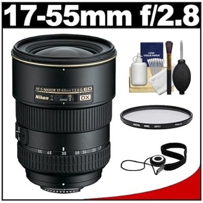 Kit includes:♦ 1) Nikon 17-55mm f/2.8 G DX AF-S ED-IF Zoom-Nikkor Lens♦ 2) Hoya 77mm HMC UV Digital Multi-Coated Slim Frame Glass Filter♦ 3) CapKeeper 2♦ 4) Precision Design 6-Piece Camera & Lens Cleaning KitThe Nikkor AF 17-55mm f/2.8G ED-IF AF-S DX Zoom Lens exceeds 3x zoom range to broaden wide angle to medium telephoto photographic possibilities, and the lens maintains fast f/2.8 aperture throughout to make it practical and easy to use. Three ED (Extra-low Dispersion) glass elements that minimize chromatic aberration and three aspherical lens glass elements that minimize distortion provide superior optical performance - even at maximum aperture and Internal Focusing (IF) design allows for smoother focusing and great body balance. Mechanical construction takes advantage of strong materials that are resilient and good looking.The Hoya 77mm HMC UV Filter is a multi-purpose filter that absorbs ultraviolet rays that often make outdoor photographs hazy and indistinct, and provides protection to your lens. This HMC (Hoya Multi-Coated) filter minimizes reflections at the filter surface which reduces flare and ghosting.Keep your lens cap securely attached to your lens with the convenient, simple-to-use CapKeeper. Never lose a lens cap again!This 6-piece cleaning kit contains everything you'll ever need to properly clean your lenses, including a Hurricane Air Blower, Lens Cleaning Tissues, Lens Cloth, Lens Cleaning Liquid, Brush and Cotton Swabs.