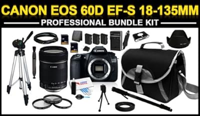 ***Included in your Canon EOS 60D EF-S 18-135mm Professional Bundle Kit***Canon EOS 60D Digital Camera (Body)Canon EF-S 18-135mm f/3.5-5.6 IS Auto Focus LensAC/DC Replacement Digital Camera Home & Travel Charger 110/220VIncludes European Adapter3 Extended Replacement Lithium Ion LP-E6 Batteries2 Secure Digital 32GB SD Memory Cards57" Tripod Full Size Photo/Video Tripod67" Aluminum MonopadUltra-light weight aluminum alloy construction. Ideal for indoor/outdoor.6' HDMI to HDMI Mini CableHigh-Definition signal up to 1080pALL in One USB Card ReaderHigh speed transfer.Plug and play USB technology. Reads over 50 formats; including SD, xD, CF, and MS.Memory Card WalletSecure memory card holder. Holds up to three memory cards....that's not all...***Also included in your kit***Lens Cleaning PenDesigned for cleaning digital cameras & lenses.3 Piece Lens Filters (UV-CPL-FLD)Ultra Violet (UV), Circular Polarizer (CPL), and a Fluorescent (FLD) Filter.Dust BlowerPerfect for keeping your camera clean.6" Mini Tabletop Tripod1 Bottle of Lens Cleaning Solution with 5 Cotton Swabs1 Scratch Safe Cleaning Cloth3 LCD Screen Guards1 Squeegee CardTulip Lens HoodRubber Lens HoodAdjustable DSLR Camera Carrying Bag