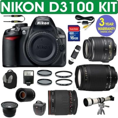 1. Nikon D3100 14.2MP Digital Camera2. Nikon 18-5mm VR Lens3. Nikon 70-300mm G Zoom Lens4. Vivitar 500mm Mirror Lens5. 2x Teleconverter Lens (up to 1000mm)6. .40x Super Wide Angle Fisheye Lens7. 650-1300mm Zoom Lens8. 16 GIG High Speed Memory Card - Class 109. 52mm UV Filter + 52mm CPL Filter10. 62mm UV Filter + 62mm CPL Filter11. Vivitar Backpack Case12. Holster Case13. Zeikos Slave Flash14. USB Card Reader15. 3 Year Celltime Warranty Repair Package