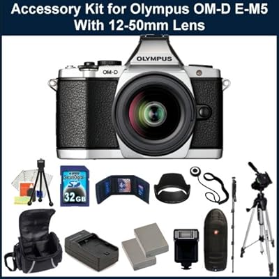 This Package Includes:- Olympus OM-D EM-5 Micor Four Thirds Digital Camera with 12-50mm Lens(Silver)- 32GB Memory Card- Memory Card Reader- Memory Card Wallet- 2 Extended Life Replacement Battery Packs- Rapid Travel Charger- Flash- Monopod- 50" Tripod- Lens Hood- Lens Cap Keeper- Table Top Tripod- LCD Screen Protectors- Cleaning Kit- Large Carrying Case
