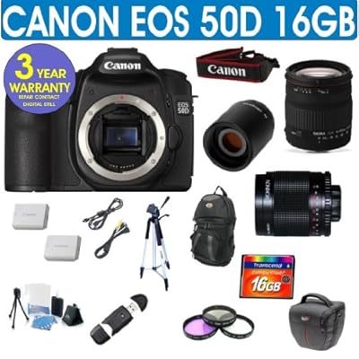 Best1 Includes Manufacturer Refurbished Canon EOS 50D Digital SLR Camera Body with 3 Year Celltime Warranty Repair Contract . Sigma 18-200 f3.5-6.3 DC Lens + 500mm Mirror Lens + 2x Telephoto T-Mount Lens + T-Mount Adapter . 16 GB Memory Card + UV Filter + Circular Polarizer Filter + FLD Filter + Camera Holster Case . Backpack Case + 57" Full Size Tripod + High Speed Memory Card Reader + Extra Rechargeable Battery . 6 Piece Starter Kit + 3 Year Celltime Warranty Repair Package . review