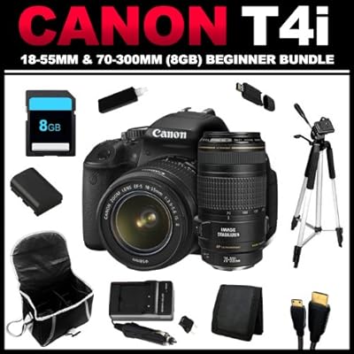 ***Included in your Canon EOS Rebel T4i 18.0 MP CMOS Digital SLR with 18-55mm EF-S IS II Lens + Canon EF 70-300mm f/4-5.6 IS USM Lens for Canon EOS SLR Cameras (8GB Beginner Bundle Kit) - 6558B003,0345B002***Canon EOS Rebel T4i 18.0 MP CMOS Digital SLR with 18-55mm EF-S IS II LensCanon EF 70-300mm f/4-5.6 IS USM Lens for Canon EOS SLR Cameras8GB SD (Secure Digital) Memory CardClass 10. High quality and reliability.BatteryLithium-Ion battery for your camera.Camera Carrying CaseMedium carrying case. Includes shoulder strap.Home/Car AC/DC ChargerCharge your battery at home and on the road. Smart LED indicator shows charging status.Memory Card WalletSafe storage for your memory cards.6' HDMI to HDMI Mini CableHigh-Definition signal up to 1080p57" Tripod Full Size Photo/Video TripodExtends to 57-Inch. 3 way pan head.(All In One) SD/SDHC Card USB Reader/WriterHigh Speed. Easy plug and play. Use with SD/SDHC/microSD/MS Pro Duo/M2.***Also included in your kit***Bottle of Lens Cleaning Solution with 5 Cotton SwabsScratch Safe Cleaning Cloth3 LCD Screen ProtectorsSqueegee Card