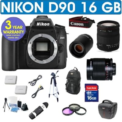 Nikon D90 12.3 megapixel DX-format CMOS imaging sensor. Nikon's EXPEED image processing technologies. Continous shooting as fast as 4.5 frames-per-second. D-Movie Mode- Cinematic 24fps HD with sound movie clips at up to 720p HD (1280 x 720 pixels, 3 inch super-density color LCD monitor).Sigma 18-200 f3.5-6.3 DC Lens allows the photographer to capture wide angle photos such as scenic, landscape or group photography and at the telephoto end is great for sports action. Portraits are also within these lenses capabilities. Compact and lightweight it's easy to carry and it will always deliver amazing images. Equivalent roughly to a 24 to 300mm lens in the larger format cameras, this lens has an impressive range and can deliver stunning images.500mm Mirror Lens2x Telephoto T-Mount LensT-Mount Adapter16 GB Memory Card3 Piece Filter KitCamera Holster CaseBackpack Case57" Full Size TripodHigh Speed Memory Card ReaderExtra Rechargeable Battery6 Piece Starter Kit3 Year Celltime Warranty Repair Package