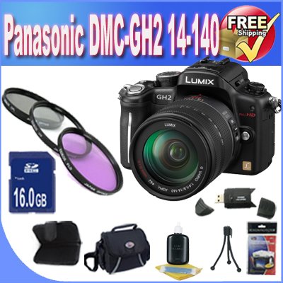 This Kit Includes! 1- Panasonic Lumix DMC-GH2 16.05 MP Live MOS Interchangeable Lens Camera with 14-140mm HD Hybrid Lens (Black) w/ All Supplied Accessories 1- 16GB SDHC Class 10 Memory Card1- USB SDHC Memory Card Reader (Download Images Quicker!)1- Deluxe Case W/Strap (Protect Your Camera!)1- Memory Card Wallet (Protect Your Photos!)1- Pack of LCD Screen Protectors (Protect from Dust And Scratches!)1- Lens/LCD Cleaning Kit1- Mini Table Size Tripod1- 3 Piece Professional Filter KitMore About This Camera!Panasonic's Lumix DMC-GH2 is the latest member of the New Generation System Camera Lumix G Micro System. Fully compliant with the Micro Four Thirds System standard, the Lumix G Micro System combines a downsized body with advanced functions that achieve both high performance and operational comfort.Featuring an intuitive touch control, the new DMC-GH2 boasts its world's fastest level Light Speed AF of approx. 0.1 second to capture the subject in spur-of-the-moment in sharp focus 1. The key components, including the sensor and the image processing engine, are totally refined to achieve even higher performance of the camera to render a stunning image with high resolution, beautiful gradation and high sensitivity.