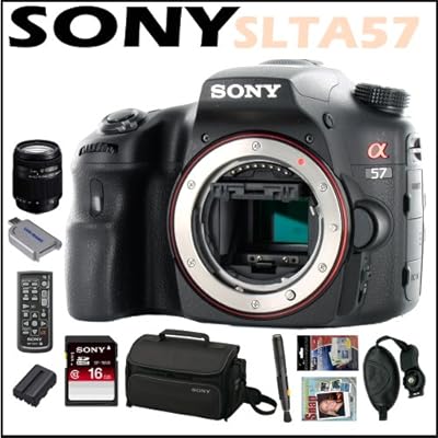 Shoot up to an amazing 12fps in Tele-zoom High speed mode, complete w/ continuous auto focus. Auto focus is also visibly faster in Live View & HD Movie modes. Translucent Mirror Technology accelerates AF performance Up to 12fps w/ Continuous AF in Tele-zoom High Speed mode Up to 10fps at full 16.1 MP w/ Sony's Exmor HD APS sensor Clear Image Zoom extends the reach of any lens Get professional portrait composition w/ Auto Portrait Framing 1080/60p/24p Full AVCHDor 1080/30p MP4 movies Tru-finder Electronic Viewfinder: big & bright Tilt/swivel 3.0 LCD , 921K dots, Tru-Blackscreen Auto HDR captures more contrast than one exposure can Steady Shot INSIDE image stabilization built into body Accurate 15-point Auto Focus system; 3 cross sensors Image layering: Multi-Frame NR & Hand-held Twilight shot Sweep Panorama Mode captures landscapes beautifully 3D Sweep Panorama Mode: incredible views to enjoy on 3DTV Translucent Mirror Technology Other DSLRs can shoot. Or they can focus w/ the speed & precision of Phase Detection AF. They cannot do both at once. The SLT-A57, w/ Translucent Mirror Technology?, directs light to both the image sensor & the Phase Detection AF sensor simultaneously. Up to 12fps Tele-Zoom High Speed Shooting By capturing the center 2/3 of the image sensor (8.4MP), Tele-zoom high speed shooting brings the action closer w/ a 1.4x effective increase of focal length. Shoot up to an incredible 12 fps w/ continuous auto focus & auto exposure to capture the decisive moment. Up to 10fps at 16.1MP capture Shoot up to 10fps in incredible detail w/ the 16.1MP Sony Exmor APS HD CMOS sensor, the camera achieves high resolution w/ no penalty in low-light sensitivity or sensor noise.*SONY 16 GB MEMORY CARD*18-250MM ZOOM LENS*SCREEN PROTECTOR*SONY CAMERA BAG*DSLR INSTRUCTIONAL DVD*REPLACEMENT BATTERY PACK*WRIST GRIP STRAP*LENS PEN CLEANING TOOL*DSLR REMOTE CONTROL*MEMORY CARD READER