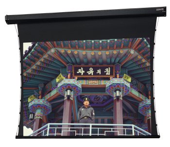 Best1 Tensioned Cosmopolitan with Audio Vision fabric and 110 volt motor. . Electric Screen that Mounts on Wall or Ceiling. Screen is tensioned for an extra flat surface for optimum image quality. Tab guide cable system maintains even lateral tension to hold surface flat while custom slat bar with added weight maintains vertical tension. . Handsome black case blends with any decor. Ideal for applications where a recessed installation is not desired or feasible. Patented in-the-roller motor mounting system for quiet operation. . Audio Vision is designed for applications where a more realistic soundstage is desired, this fabric allows for the installation of speakers to be placed behind the surface. With virtually no sound loss and good image quality, this fabric provides the same optical characteristics as the Da-Mat surface with specially designed perforations to allow sound to pass through the screen material. Gain 1.0 with a 50-degree viewing half angle. . review